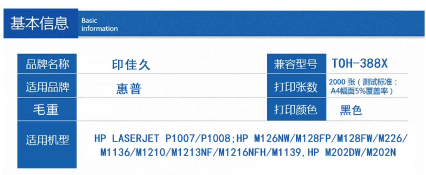 印佳久TOH-388X黑色硒鼓适配惠普HP Laserjet P1007/P1008/1106/1108/M126a/M126nw/M128fn/ M128fp/M128fw/M226dn